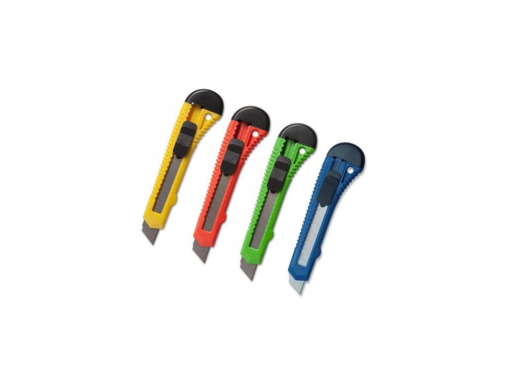 Odlamovací nůž 18 mm, lamela vsazená do plastových vodících lišt, zatahování břitů pomocí palcového tlačítka. Mix barev, cena za 1 kus.