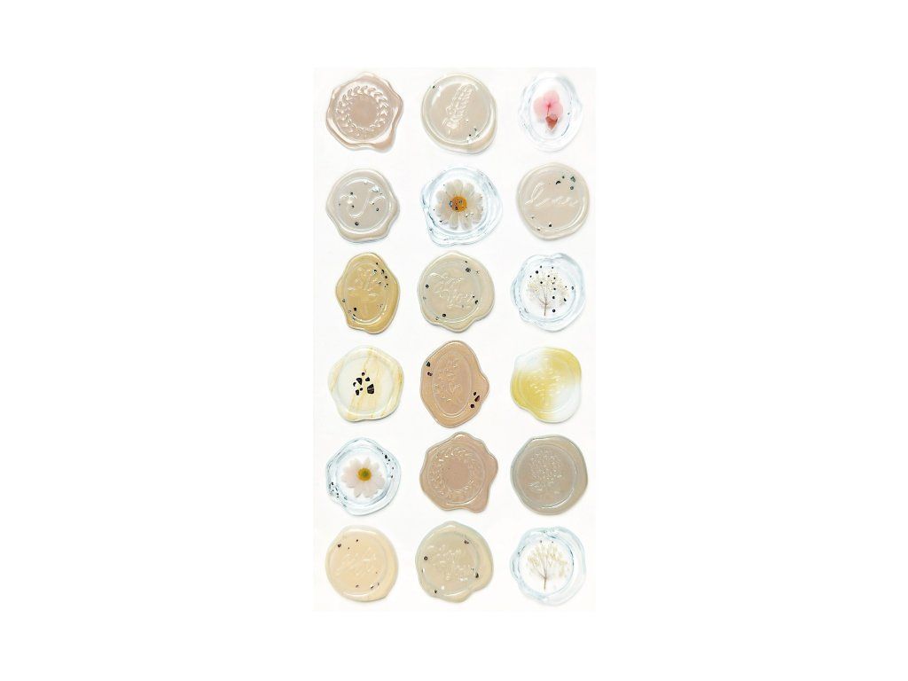 Samolepky ve formě pečetí v béžové barvě. Na aršíku je 18 ks.