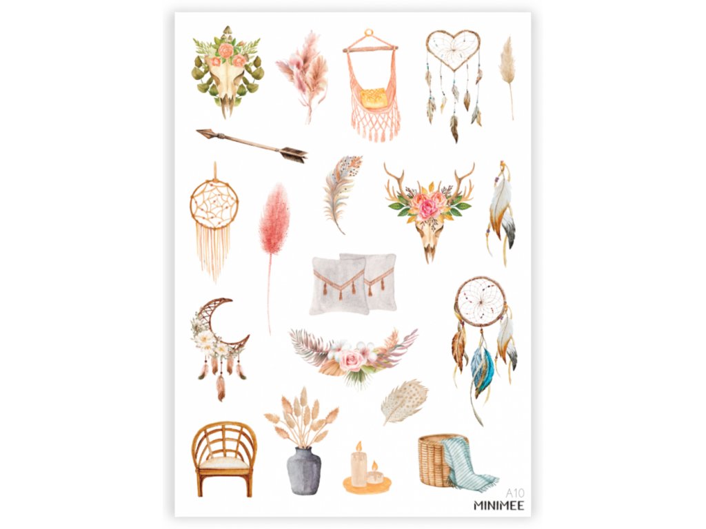 Krásné vyřezávané watercolor samolepky v aršíku A5 s boho motivy. Lapače snů, peříčka, houpačka i křesílko. S těmito motivy můžete vytvořit krásné boho přehledy. Samolepky se perfektně hodí k papíru zápisníku MINIMEE. Kvalitní bílá samolepka matného, přírodního vzhledu.