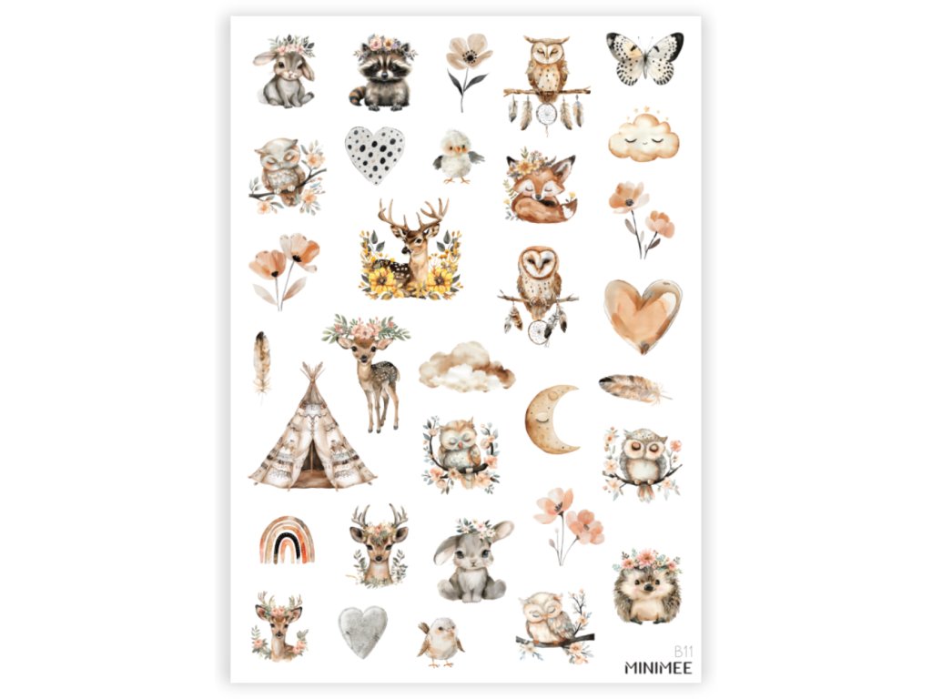 Krásné vyřezávané samolepky v aršíku A5 s boho zvířátky a boho prvky z lesa. Perfektně se hodí k papíru zápisníku MINIMEE. Kvalitní bílá samolepka matného, přírodního vzhledu.