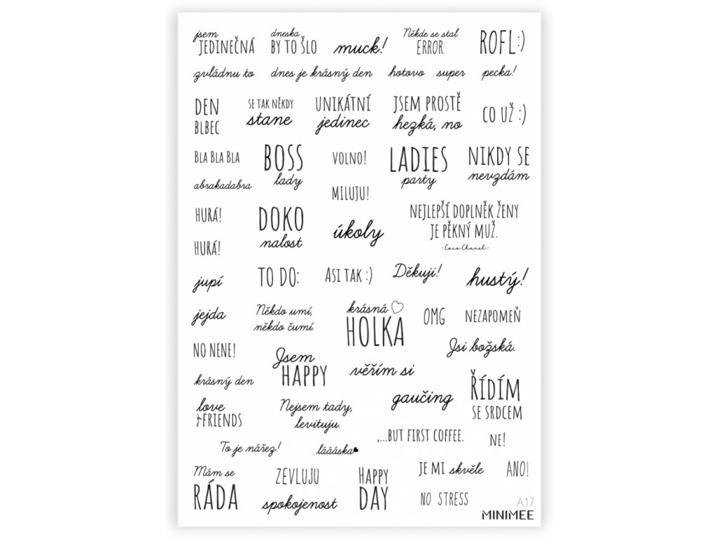 Krásné vyřezávané samolepky v aršíku A5, které obsahují vtipné a stylové dámské hlášky. Perfektně se hodí k papíru zápisníku MINIMEE. Kvalitní bílá samolepka matného, přírodního vzhledu.