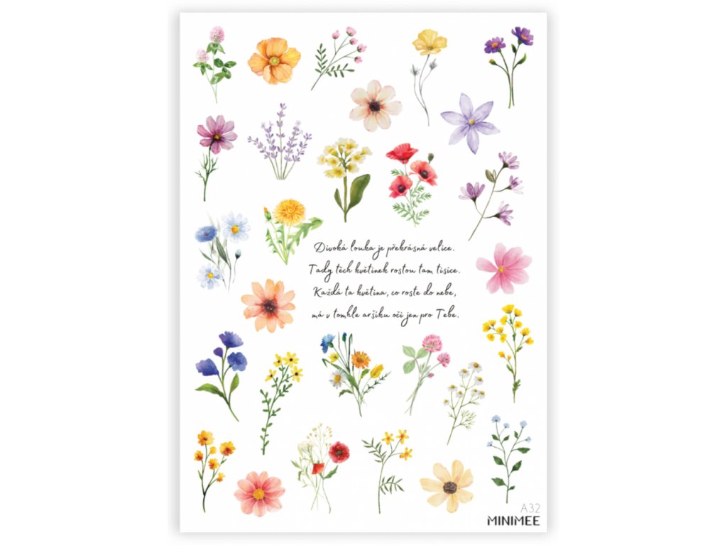 Krásné vyřezávané samolepky v aršíku A5, s motivy květin z divoké louky a autorskou básní.