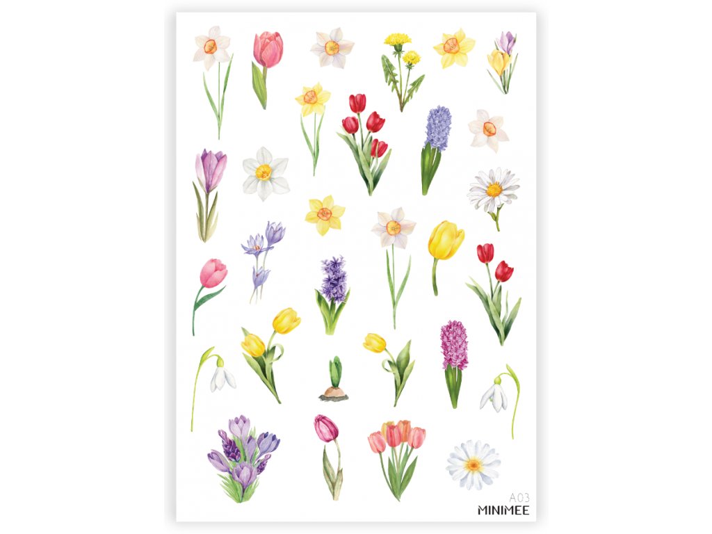 Krásné vyřezávané samolepky v aršíku A5 s motivy jarního kvítí - tulipány, narcisky, sněženky, krokusy, aj. Kvalitní bílá samolepka matného, přírodního vzhledu.