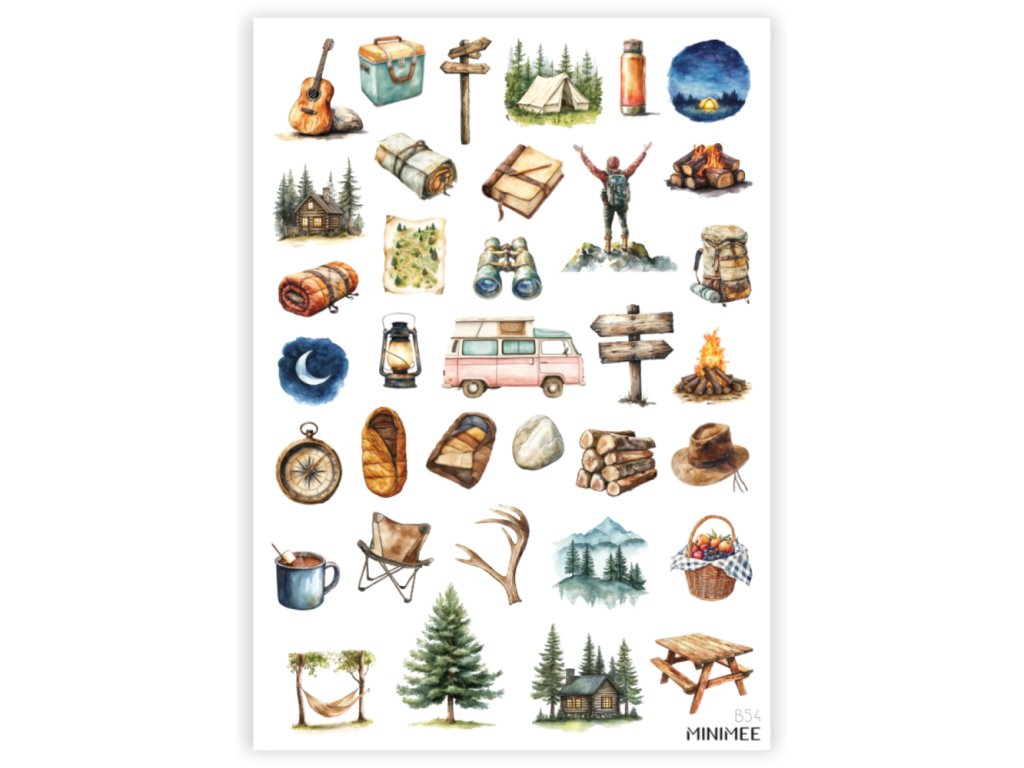 Papírové samolepky v aršíku A5 Kempování