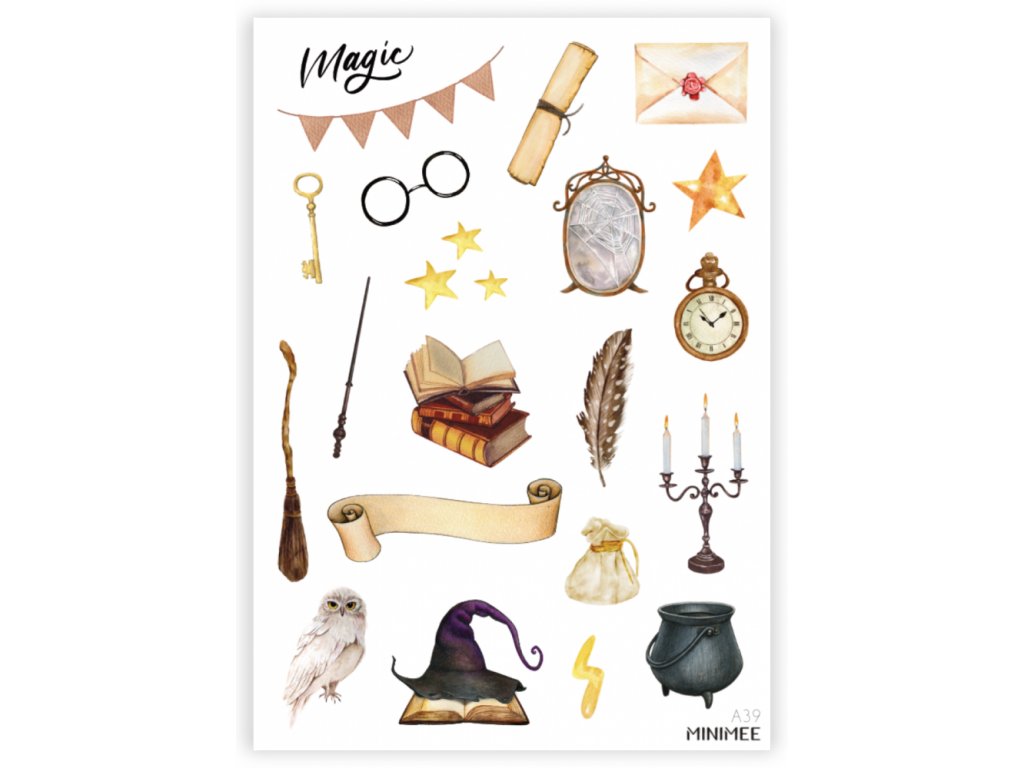 Krásné vyřezávané samolepky v aršíku A5 s kouzelnickými motivy. Kvalitní bílé samolepky matného, přírodního vzhledu.