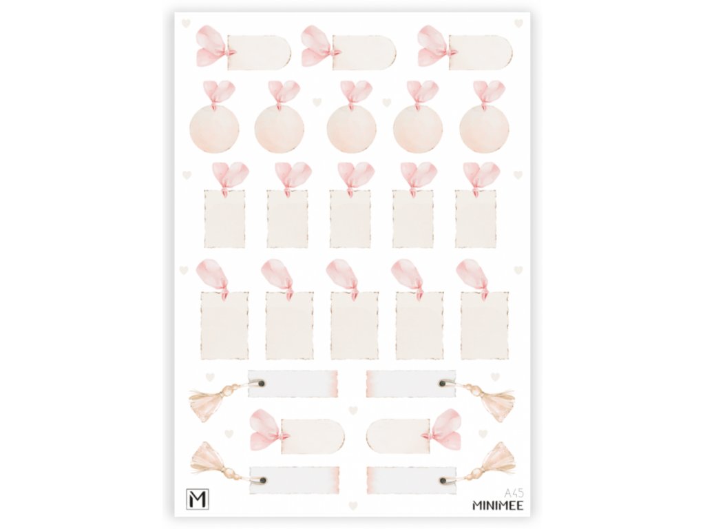 Krásné vyřezávané watercolor samolepky v aršíku A5. Aršík zahrnuje různé štítky krémové barvy s růžovou ozdobou.