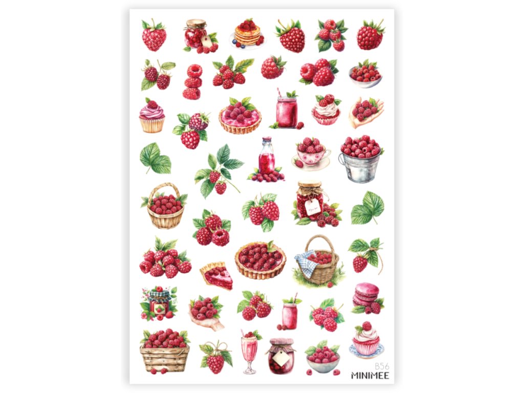 Samolepky české výroby s motivy malin pro scrapbooking, bullet journal, zdobení alb a zápisníků. Předvyseknuté samolepky neprůhledné.