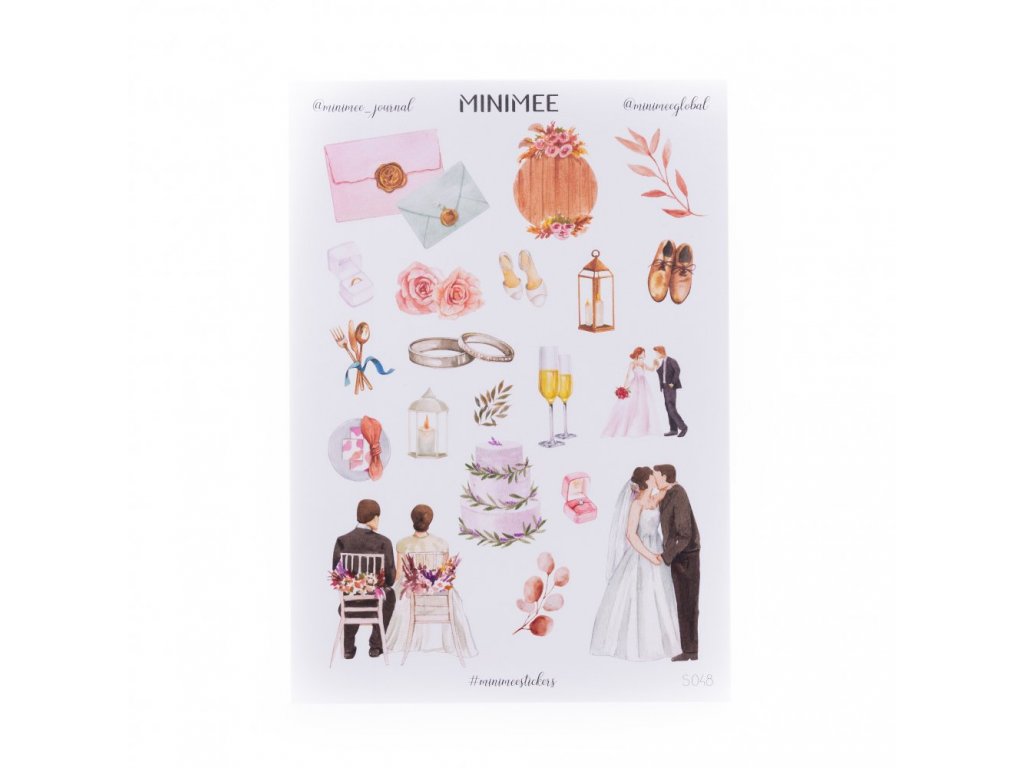 Samolepky se svatebním zamilovaným motivem jsou natištěny na bílém archu, jsou samolepící, předvyseknuté, neprůhledné. Skvělé na dozdobení přáníček, scrapbookových...
