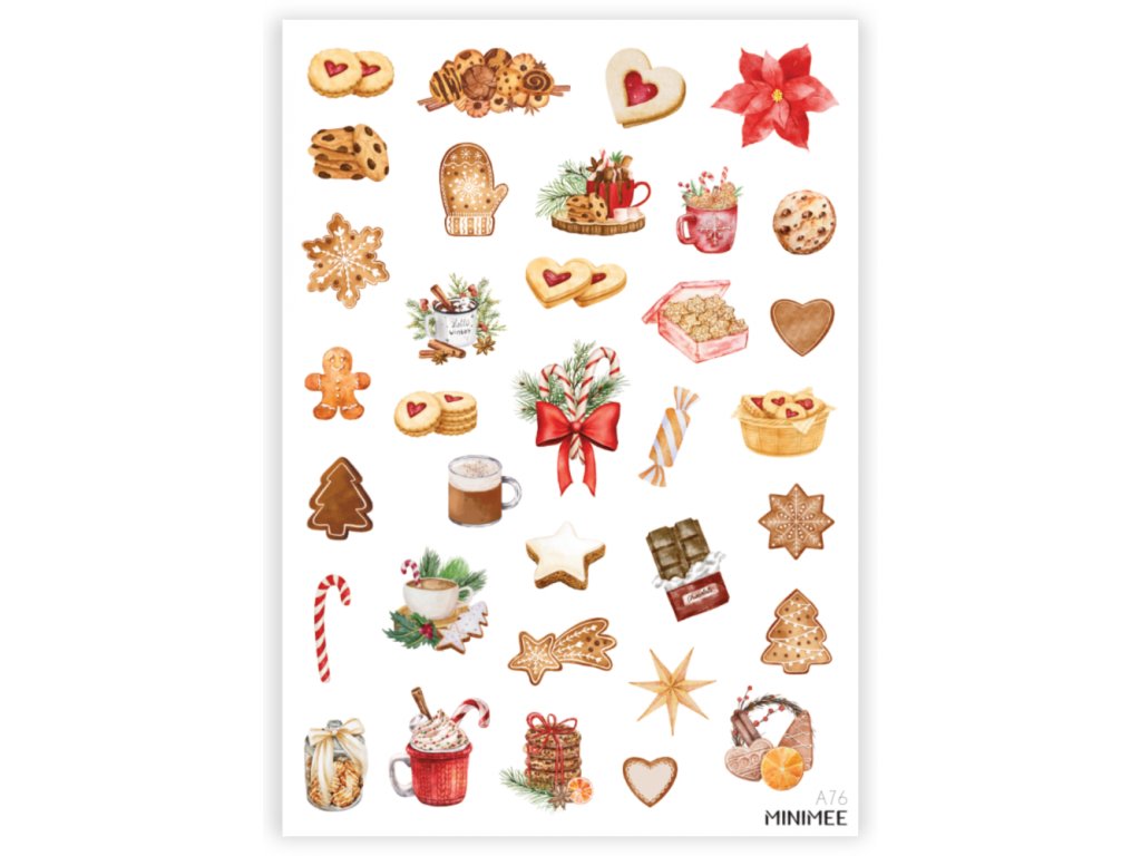 Krásné vyřezávané samolepky v aršíku A5 s dobrůtkami, které naladí na vánoční atmosféru. Perfektně se hodí k papíru zápisníku MINIMEE. Kvalitní bílá samolepka matného, přírodního vzhledu.