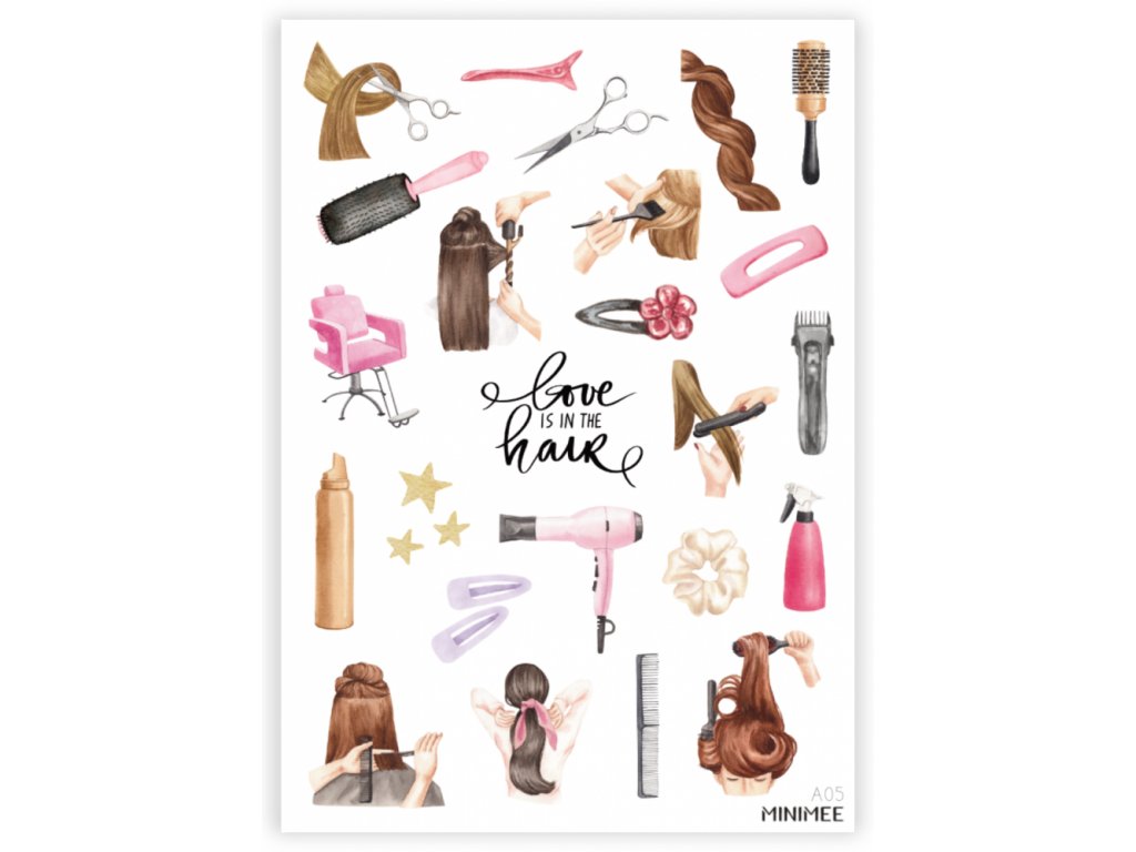 Krásné vyřezávané samolepky v aršíku A5 související s vlasy a úpravou vlasů. Kvalitní papírové samolepky matného vzhledu.