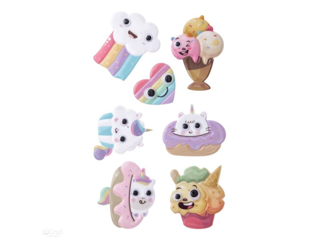 Vyypouklé samolepky puffy se sladkostmi jsou roztomilé prvky s pohyblivými očky, které dodají jedinečný charakter různým rukodělným projektům. Vzory pohádkových sladkostí a tvorů se skvěle hodí při vytváření narozeninových přání pro nejmenší, pozvánek na narozeniny, zdobení alb a dalších scrapbookingových projektů.