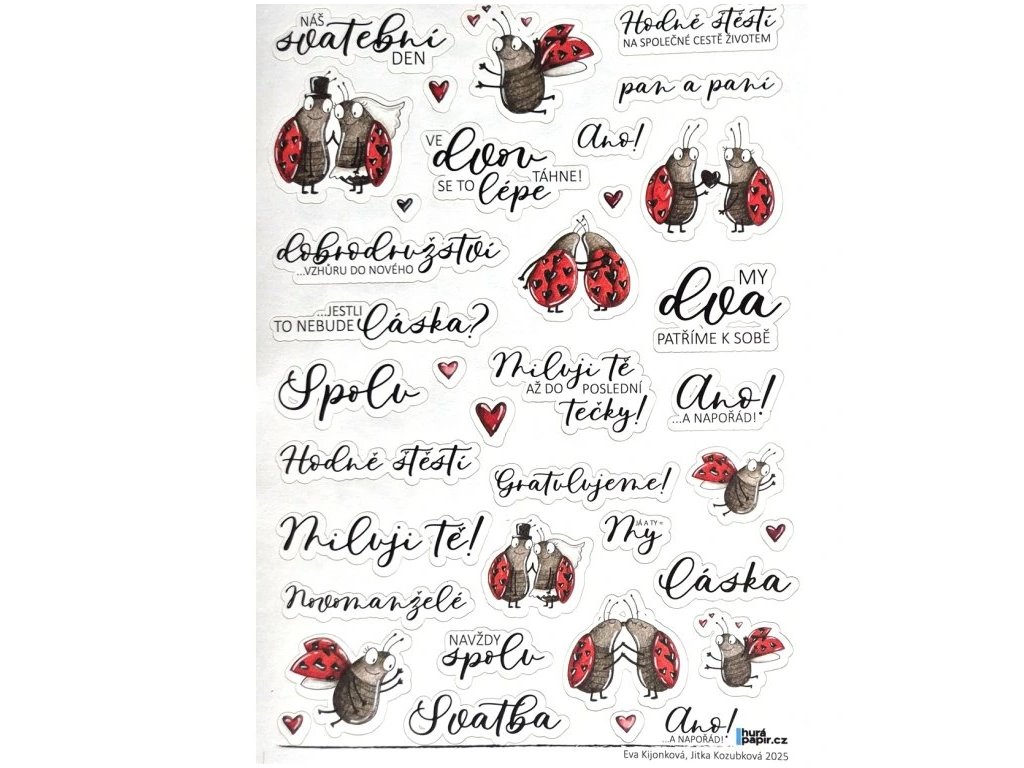 Samolepky se svatebním zamilovaným motivem jsou natištěny na bílém archu, jsou samolepící, předvyseknuté, neprůhledné. Skvělé na dozdobení přáníček, scrapbookových...
