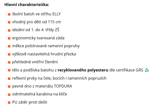 Do boční kapsy se pohodlně vejde lahev o objemu 0,5 litru. Batoh je vybaven reflexními prvky na čele, bocích i ramenních popruzích, které zvyšují bezpečnost dítěte na cestě do školy.