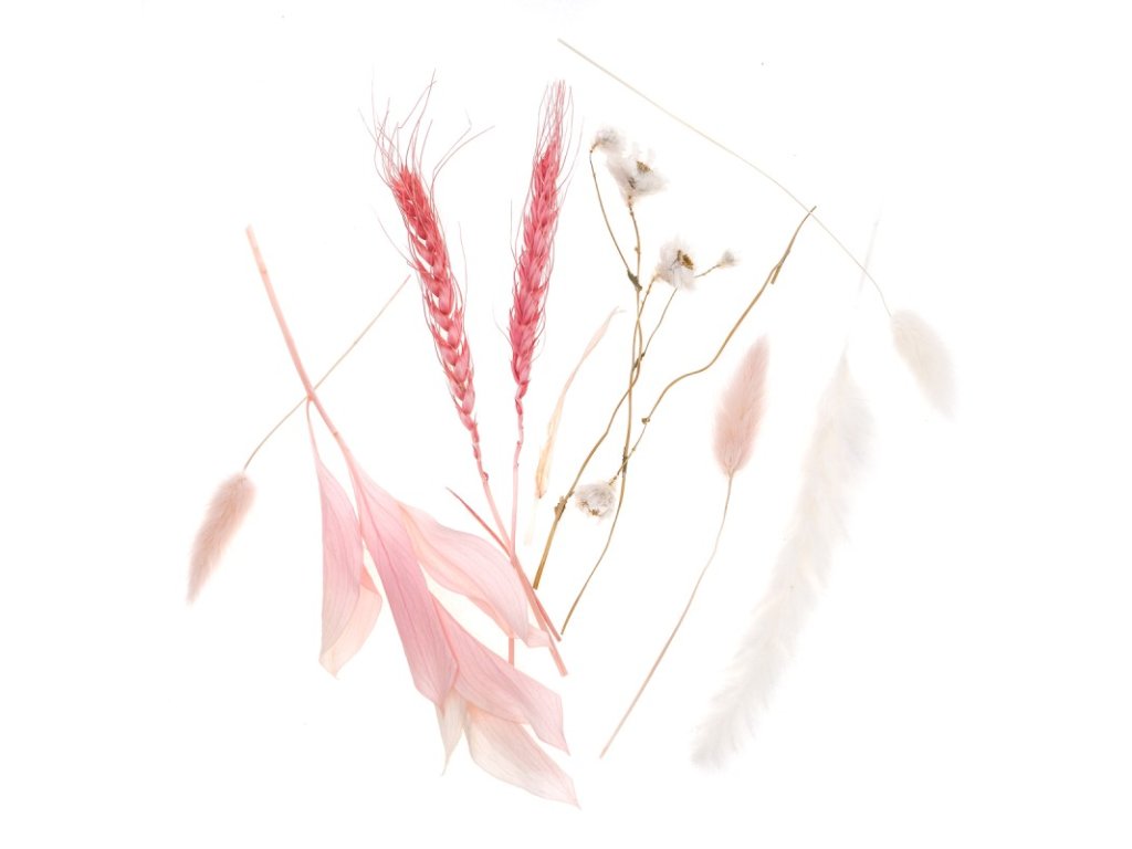 Součástí kytice jsou: bílo-růžové listy, růžová pšenice, růžový lagurus, bílý lagurus, malá bílá tráva, bílá sedmikráska