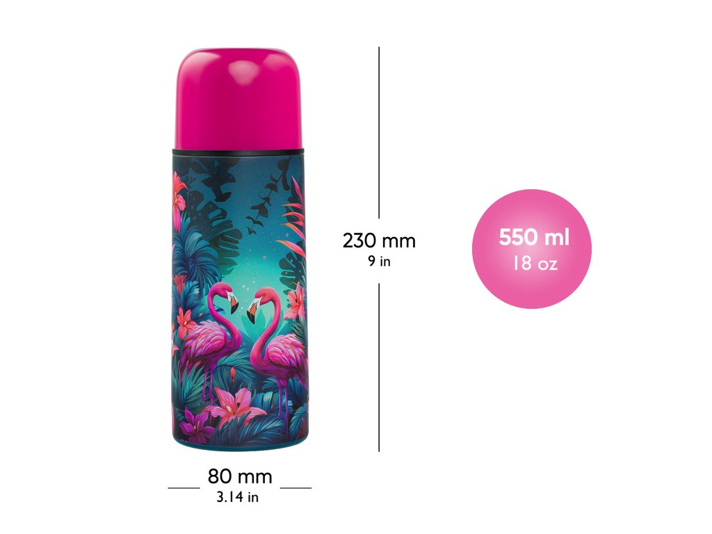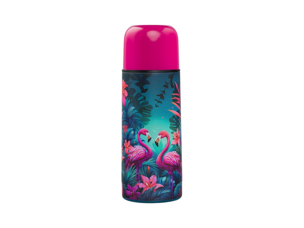 Stylová termoláhev s motivem růžového plameňáka a šroubovacím víčkem.