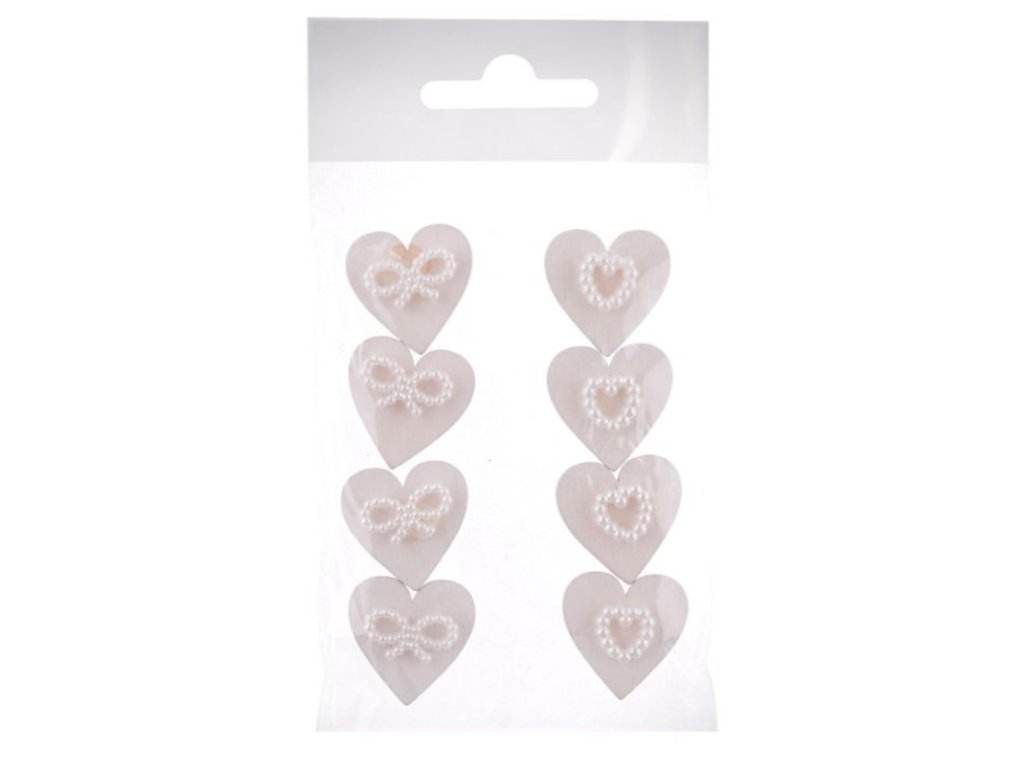 Nálepky dřevěné Srdce 2,5cm, 8ks bílé s perličkami