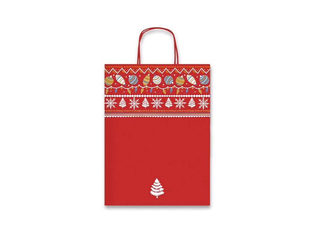 Dárková papírová taška laděná do červené barvy s atraktivním vánočním motivem.