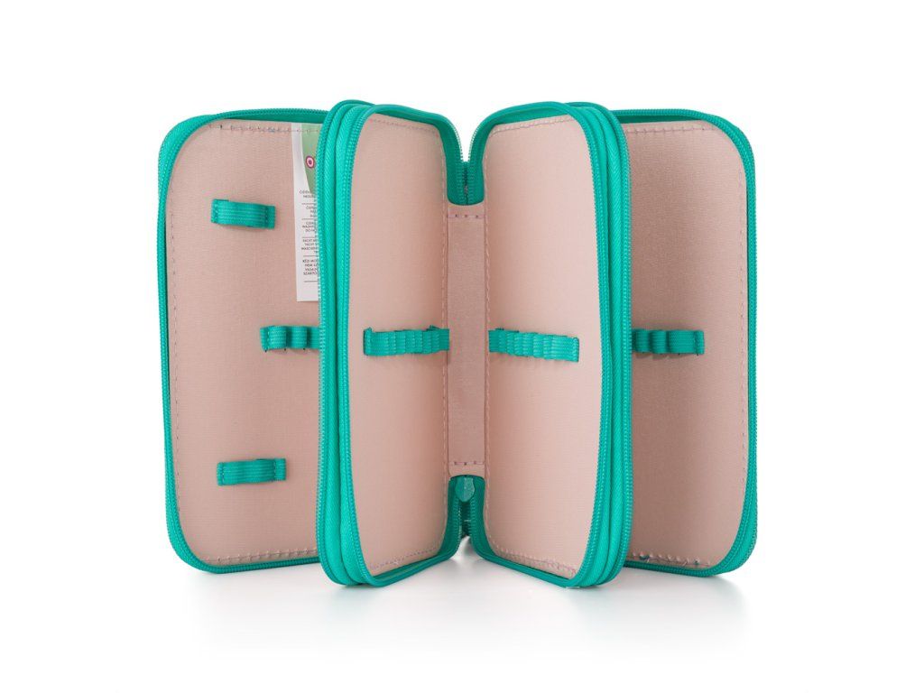 Každé ze tří pater se otevírá samostatným zipem s velkými taháčky, takže ani ta nejmenší ručička si nebude lámat nehty při otevírání. Uvnitř najdete celkem 41 gumových poutek, která bezpečně udrží každou tužku, pero, pastelku, fix i drobnosti přesně tam, kde mají být – žádné válení po dně batohu, žádné hledání za pět minut před hodinou.
