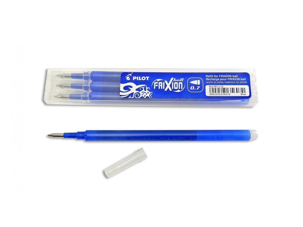 Náhradní náplň do rollerů Pilot Frixion Point šíře stopy 0,7 v balení 3ks. Náplň má speciální inkoust - napsaný text lze vymazat a znovu přepsat na tomtéž místě. Text vymažete opačným koncem rolleru.