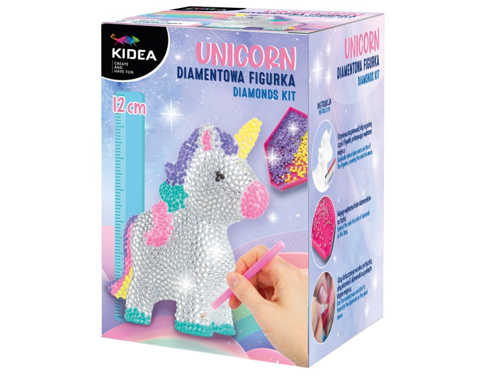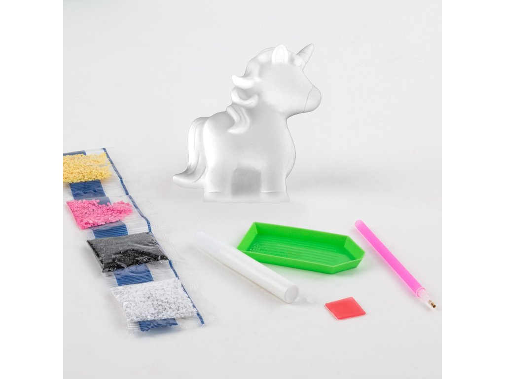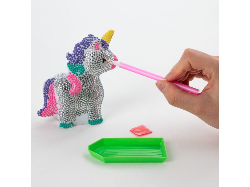 Velká 3D diamantová figurka jednorožce, vysoká až 12 cm, připravená k polepení diamanty. Nejprve postupně naneste lepidlo na požadované oblasti figurky, poté vyberte barvu diamantu a nalijte je do tácku. Pomocí přiloženého stylusu naneste diamanty na figurku a přizpůsobte je lepeným plochám. Pokračujte v práci, dokud nebude jednorožec kompletně ozdoben třpytivými krystaly a nezačne krásně třpytit. Konečným výsledkem je jedinečné 3D umělecké dílo, které krásně ozdobí místnost nebo bude jedinečným dárkem. Je to také skvělá hračka. Sada obsahuje: 3D figurku, lepidlo se štětcem a sadu diamantů v 6 barvách: černá, bílá, žlutá, fialová, růžová a tyrkysová.