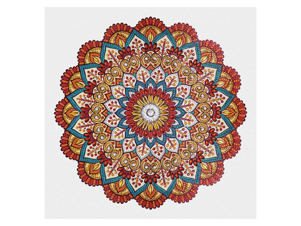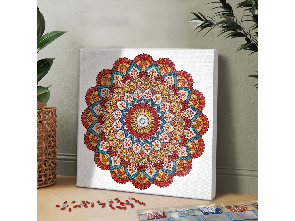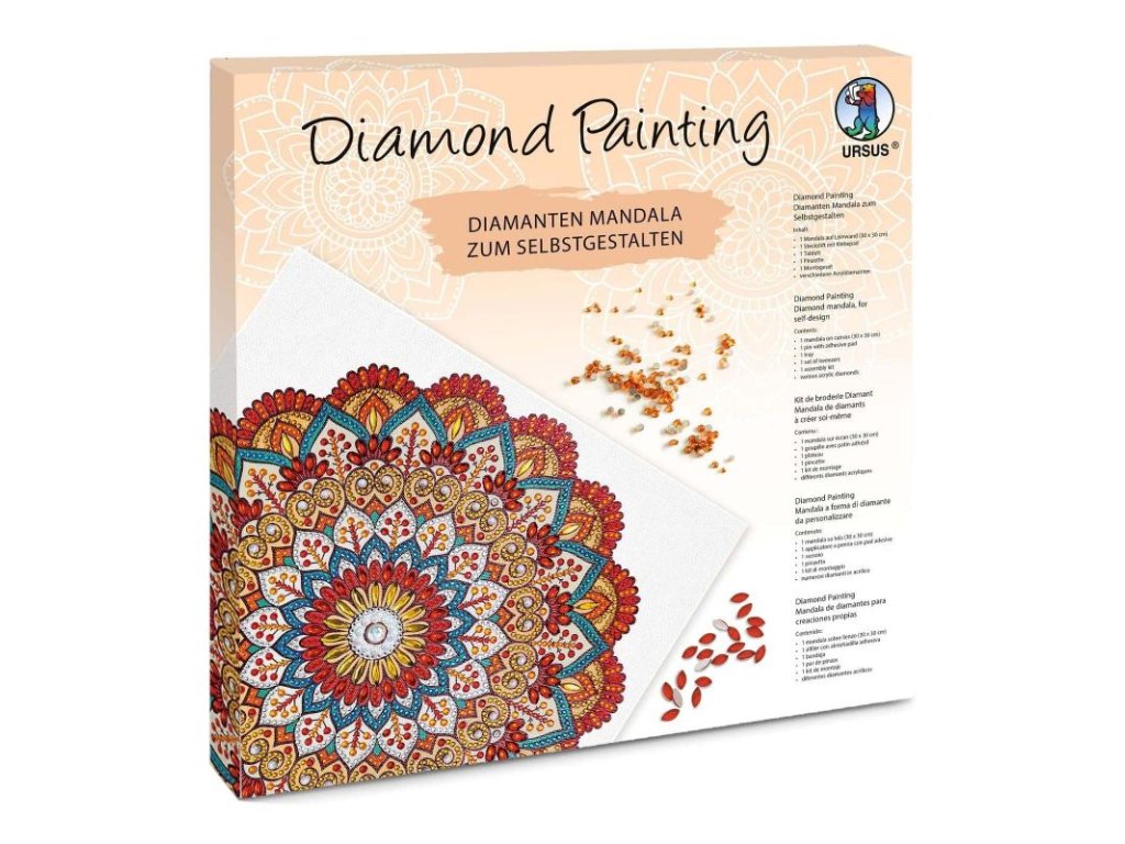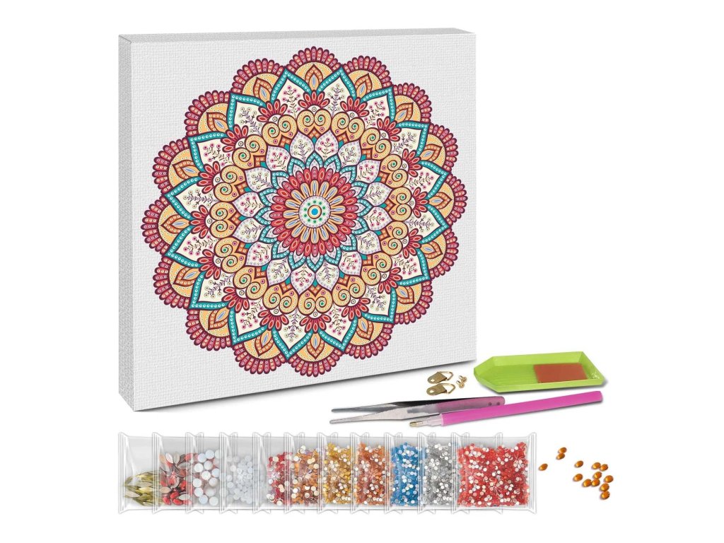 Kreativní sada mandala namalovaná na plátně 30x30cm je připravena na doplnění technikou diamond painting, kdy se do obrázku nalepují kamínky různých velikostí. Diamond Painting podporuje jemné motorické schopnosti a nabízí kreativní zábavu pro děti i dospělé. Balení obsahuje plátno na rámu 30x30cm, nástroj na nabírání diamantů (špendlík) s lepicí podložkou, zásobník, pinzetu, závěsné háčky na plátno, různé velikosti diamantů a tištěnou tabulku se symboly. Na zadní straně balení je fotonávod na použití sady.
