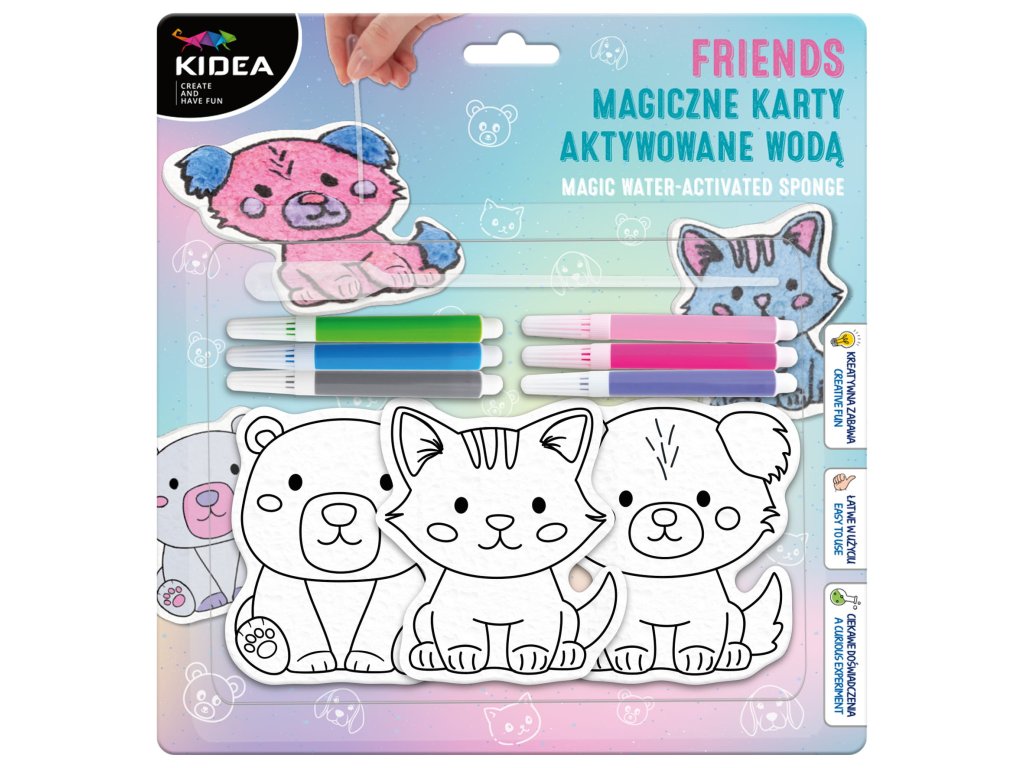 Kouzelné karty aktivované vodou. Sada obsahuje 3 kouzelné karty ve tvaru medvídka, kočky a psa, pipetu pro přesné dávkování vody a 6 barevných fixů. Jednoduše naneste kapky vody na vybraná místa a materiál začne bobtnat a vytvářet 3D efekt. Toto spojení vědy a umění zaujme každé dítě.