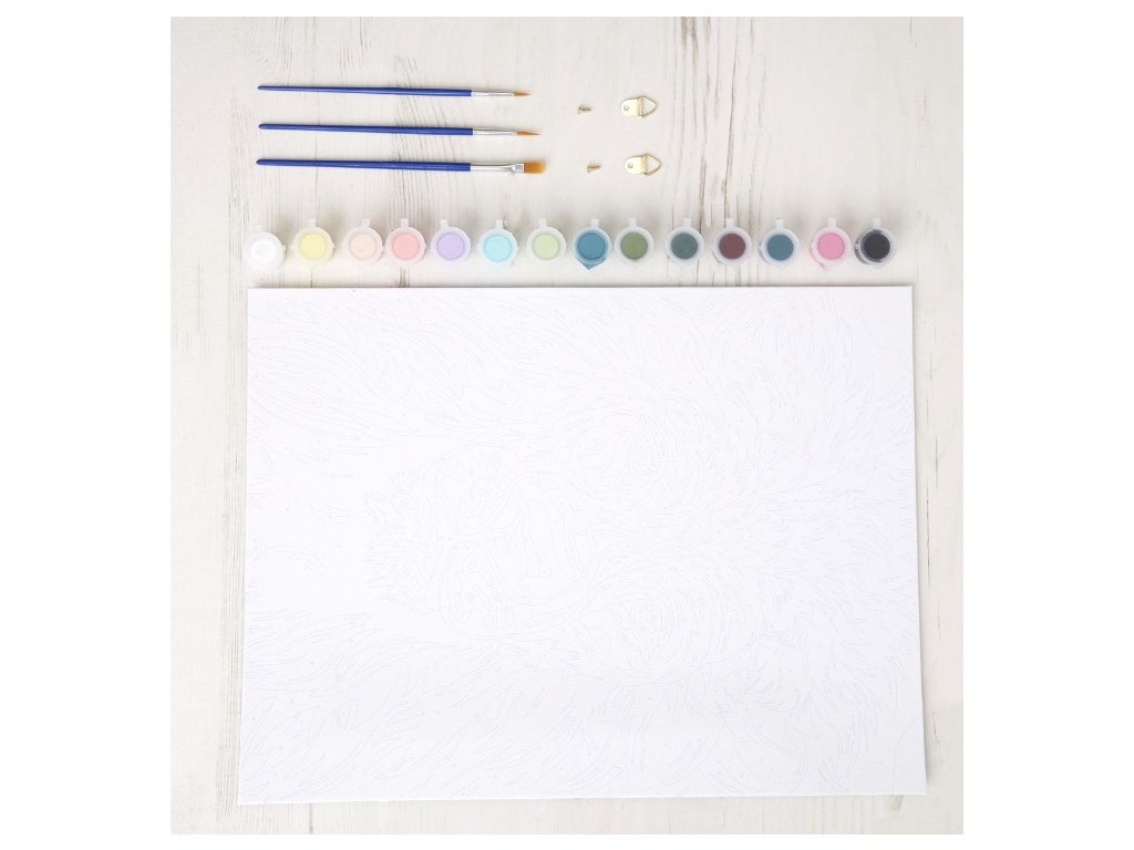 Sada obsahuje: kartonové plátno 395 x 295 x 2 mm, 14 zásobníků akrylové barvy a 3 štětce.