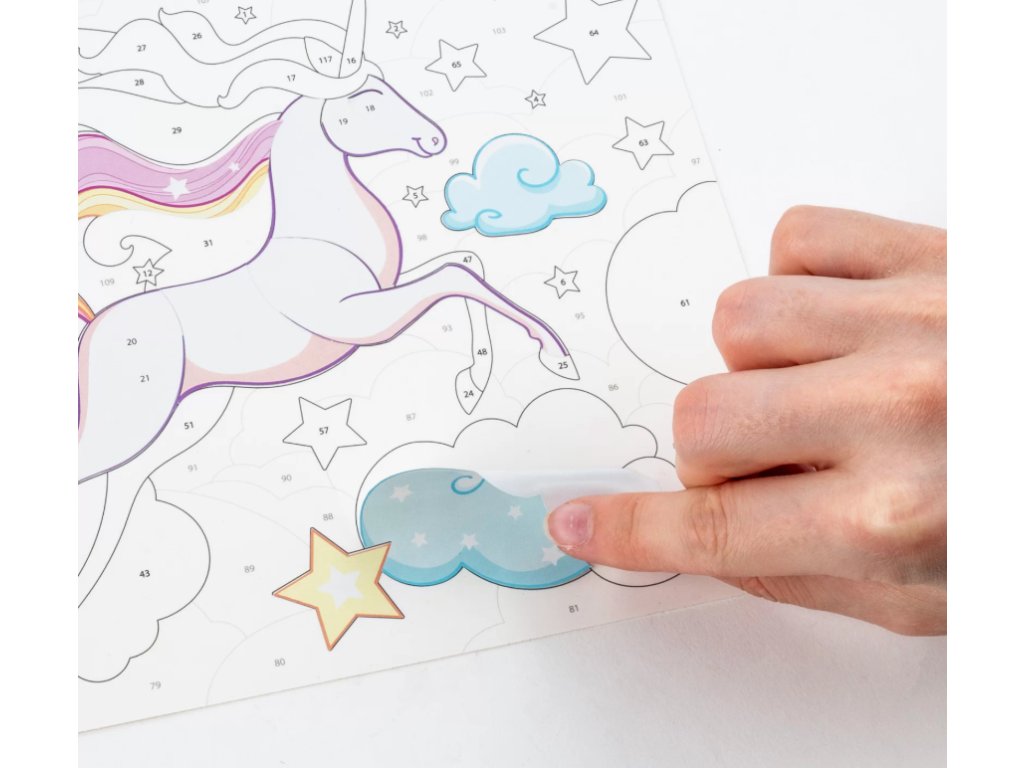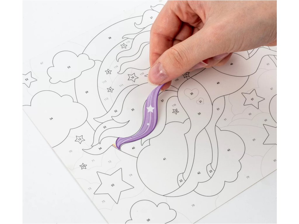 Vytvořte krásné obrazy bez barev a štětců. Tento proces malování podle čísel je zábavný způsob, jak vytvářet krásné obrazy. Obraz má očíslovaná políčka, která jsou vyplněna příslušnými samolepkami z přiložených archů. Každé číslo označuje, kam kterou samolepku nalepit, což usnadňuje a usnadňuje hraní. Tento obraz rozvíjí soustředění a přesnost a zároveň zajišťuje čisté ruce a prostředí bez nepořádku.
