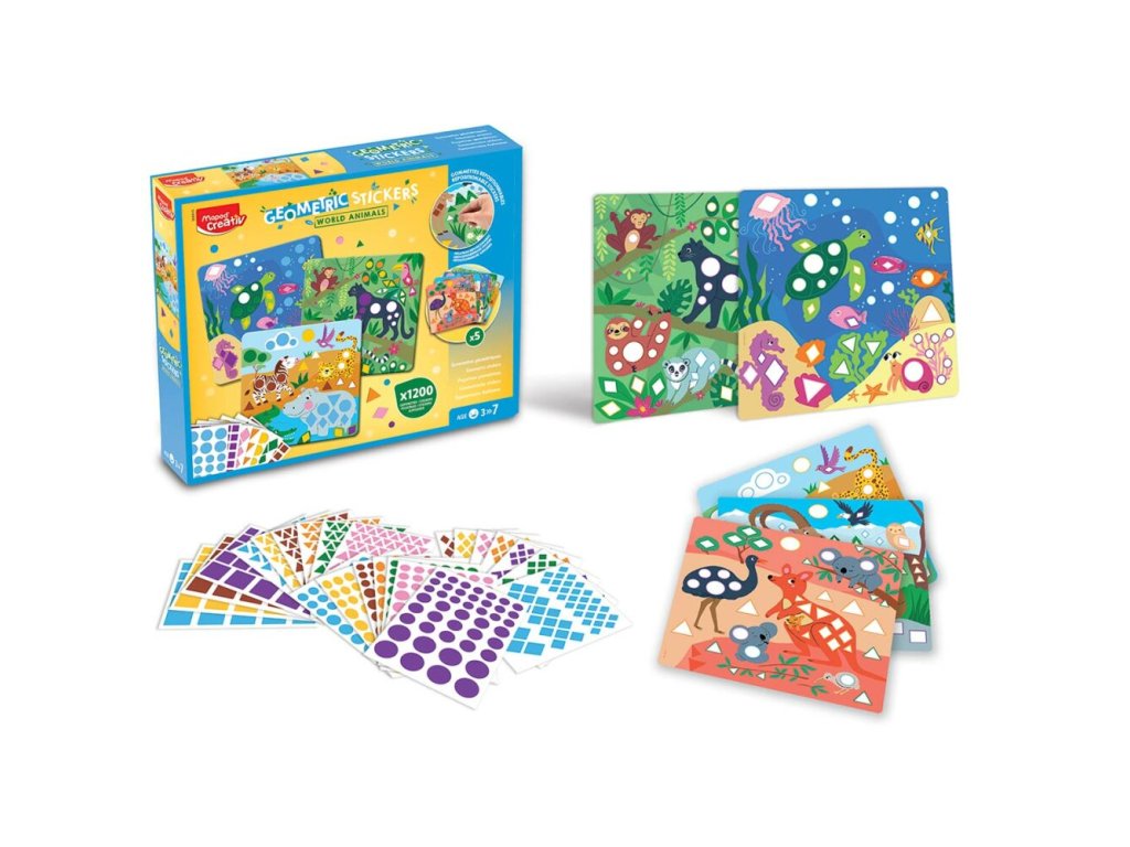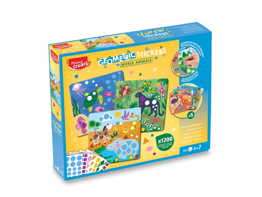 Kreativní sada Maped Creativ Geometric Stickers World Animals zve děti na objevnou cestu za zvířaty z celého světa prostřednictvím zdobení pěti barevných kartiček pomocí více než 1 200 geometrických samolepek. Bohatá paleta tvarů a barev dává prostor kreativitě a samolepky lze použít nejen na kartičky, ale i kamkoli jinam. Hravou formou si děti rozvíjejí jemnou motoriku i pozorovací schopnosti a díky přemístitelným samolepkám se nemusí bát chyb.