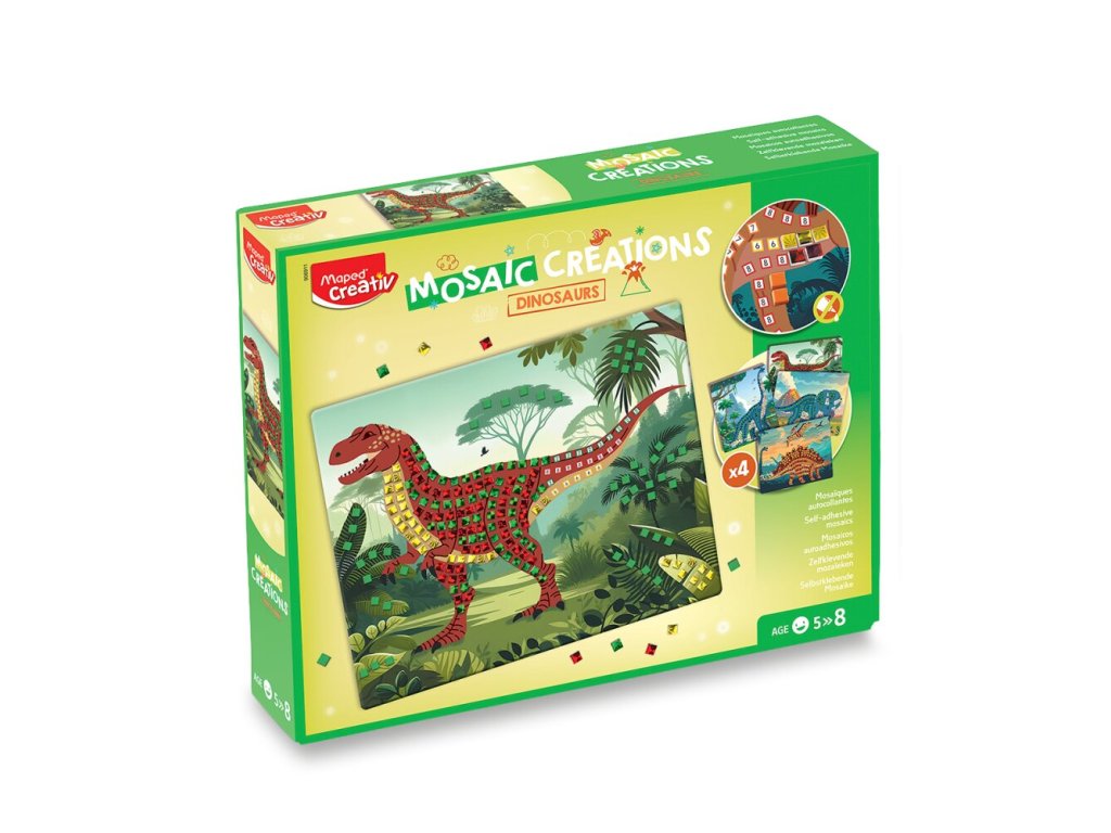Kreativní sada Maped Creativ Mosaic Creations Dinosaurs umožňuje dětem ozdobit čtyři působivé dinosaury pomocí samolepicí mozaiky a vydat se na kreativní cestu do světa dinosaurů. Díky jednoduchému principu bez lepidla je aktivita snadná a přehledná, přičemž každá barva mozaiky odpovídá určitému číslu. Hravou formou tak děti rozvíjejí jemnou motoriku, soustředění i kreativní myšlení.