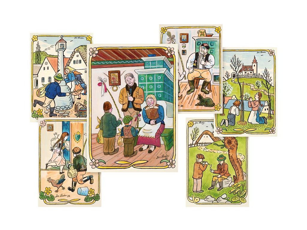 Velikonoční pohlednice s krásnou ilustrací od Josefa Lady, která znázorňuje české tradice harmonického venkova. Popřejte svým blízkým krásné svátky jara. Pohledy jsou bez textu na zadní straně.