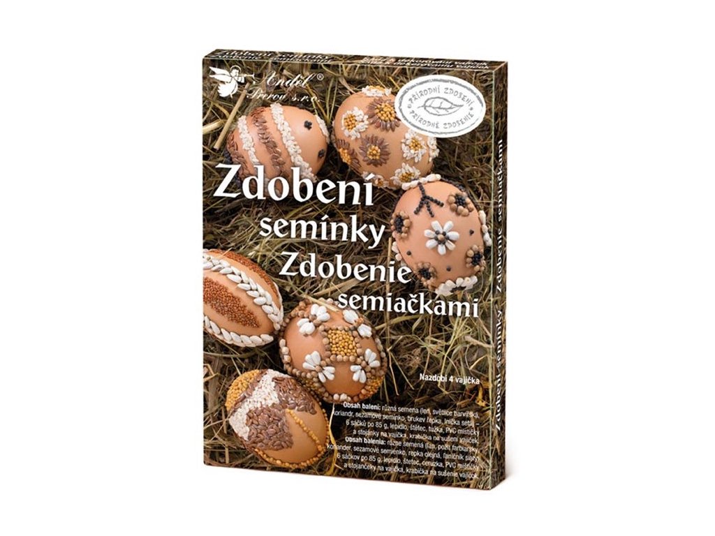 různá semena (len, světlice barvířská, koriandr, sezamové semínko, brukev řepka, lnička setá) - 6 sáčků po 85 g, lepidlo, štětec, tužka, PVC mističky a stojánky na vajíčka, krabička na sušení vajíček.