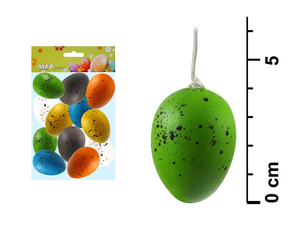 Velikonoční plastová vajíčka - malé skvrnky Balení obsahuje: 12 ks plastových vajíček a v každém balení jsou 2 vajíčka bílá, žlutá, oranžová, šedá, modrá a zelená. Vajíčka mají šňůrku na pověšení. Velikost vajíčka je 4 cm. Velikost balení: 14 x18,2 x3 cm