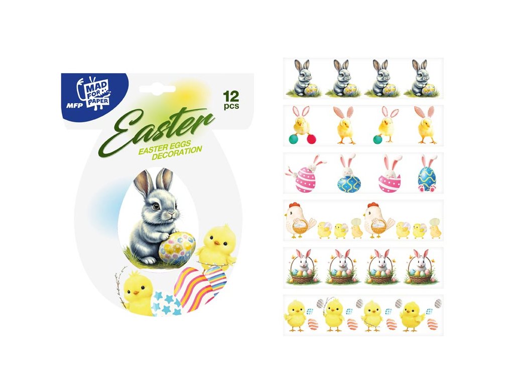 Velikonoční obtisky na vajíčka v mixu veselých motivů umožní vytvořit krásně zdobené kraslice během několika minut. Roztomilé ilustrace se zvířátky a velikonočními symboly dodají vajíčkům hravý a sváteční vzhled bez nutnosti složitého malování.