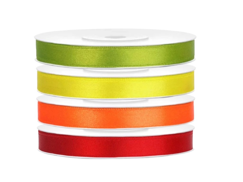 Sada obsahuje stuhy v barvách žlutá, oranžová, zelená a červená. Každá v návinu 25m a šířce 6mm.