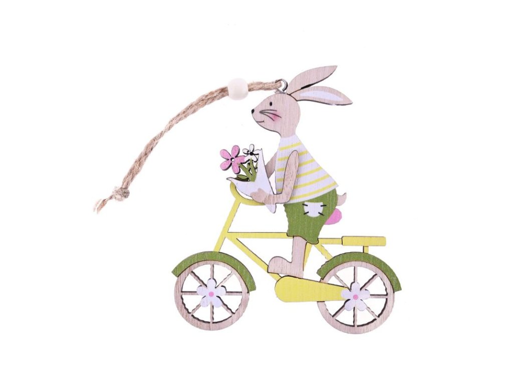 Velikonoční závěsná dekorace v podobě zajíce jedoucího na kole.