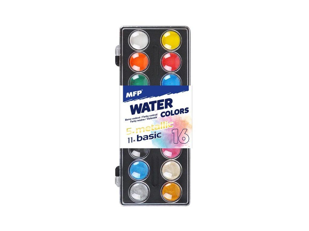 Sada vodových barev, 11 klasických a 5 metalických barev, velikost puku 23 mm. Barvy jsou vhodné zejména na malbu na papír či karton. Namalujte si s dětmi obrázek pomocí vodových barev, které vynikají jasnou barevností. Děti se zabaví a navíc rozvinou motoriku ruky a svou fantazii.