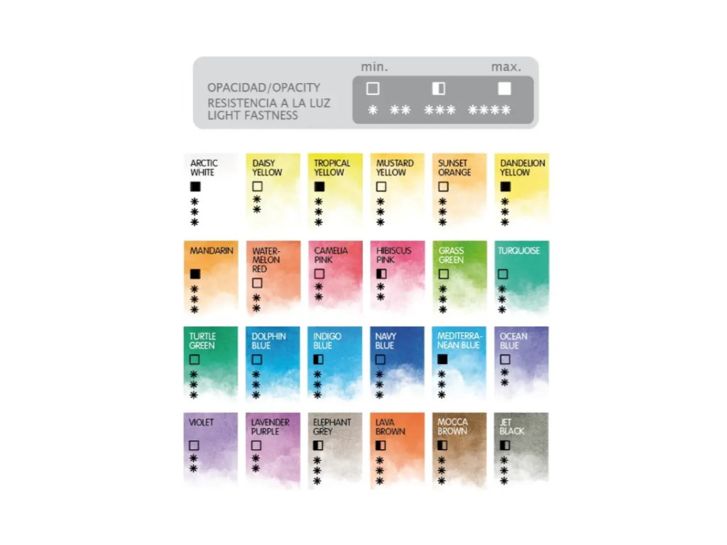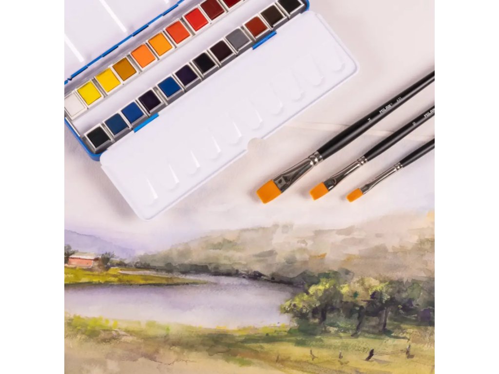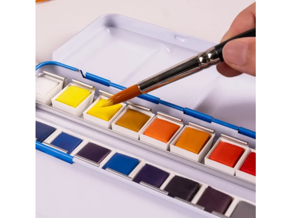 Sada 24 akvarelových barev v kovové nádobě. Vyrobeno z vysoce kvalitních, neprůhledných a světlostálých pigmentů, barvy se perfektně mísí a snadno se mísí. Praktická kovová nádoba ve víku obsahuje užitečnou, dělenou paletu pro míchání barev. Jsou navrženy speciálně pro umělce a lze je snadno prát z většiny látek.