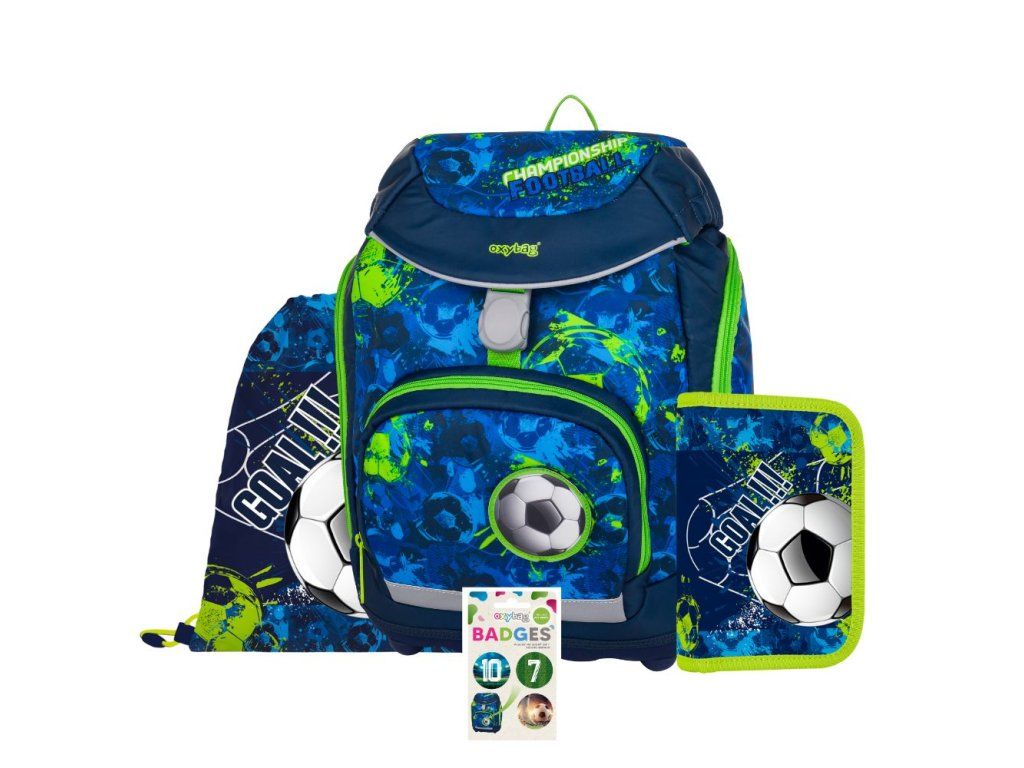 Školní set OXY Sherpy fotbal – aktovka, jednopatrový penál, sáček na přezůvky a vyměnitelné placky