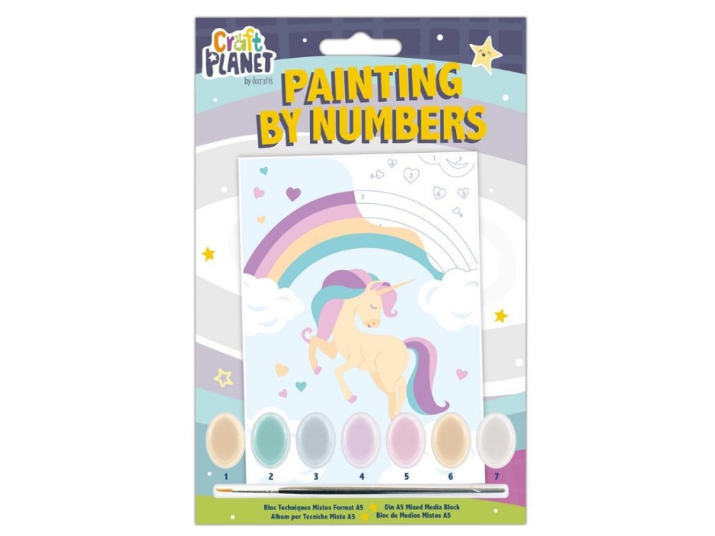 Akrylová barva poskytuje dobré krytí na desce s jednoduchým vzorem s vytištěnými číslovanými krabičkami. Obrysy a čísla polí jsou jasně označeny, což dítěti pomůže aplikovat do vyznačeného pole správnou barvu.