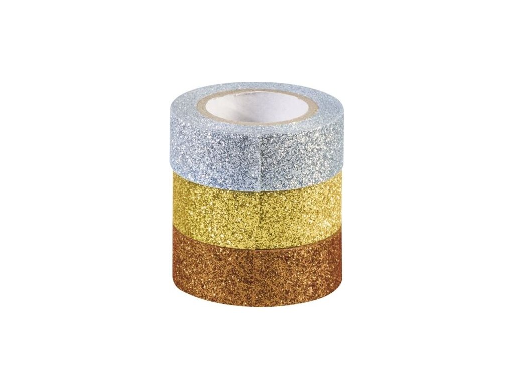 Papírová ozdobná páska, samolepící (Washi Tape), stříbrné třpytky, zlaté třpytky a metalická zlatá. Super pro scrapbook, dárkové balení a další dekorování.