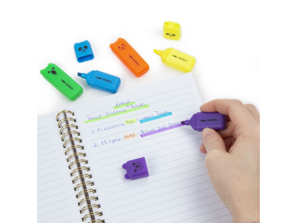 Zvýrazňovače ve tvaru zvířátek v pěti zářivých barvách: žluté, oranžové, zelené, modré a fialové. Navzdory své malé velikosti, která jim umožňuje vejít se do jakéhokoli penálu, jsou neuvěřitelně efektivní.