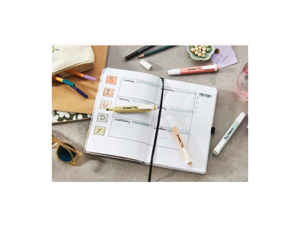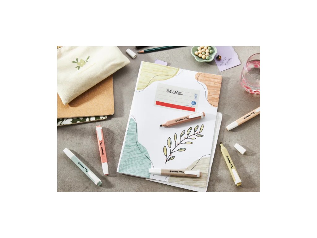 STABILO swing cool NatureCOLORS nabízí estetické akcenty a dodává textům jemnou strukturu - v barvách jako siena, bahenní zelená a zemitá zelená. Díky zkosenému hrotu jsou dvě šířky stop - 1mm a 4mm - takže zvýrazňovač lze použít jak pro zvýraznění, tak pro podtržení.